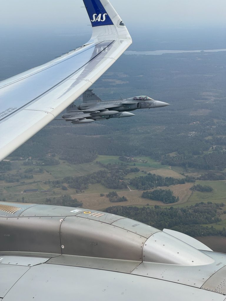 Resan till flygplatsen och incheckningen gick snabbt och smärtfritt. Även flygresan gick smidigt. Det coolaste var att när vi närmade oss Stockholm och berättar piloten. Vi kommer att bli eskorterade av 4st JAS 39 Gripen. Bara en kort stund senare gled 4st stridsflyg upp bredvid oss och eskorterade oss över Stockholm. Det var första gången jag flög över stockholmsstad och det var också första gången som jag blev eskorterad av stridsflyg.