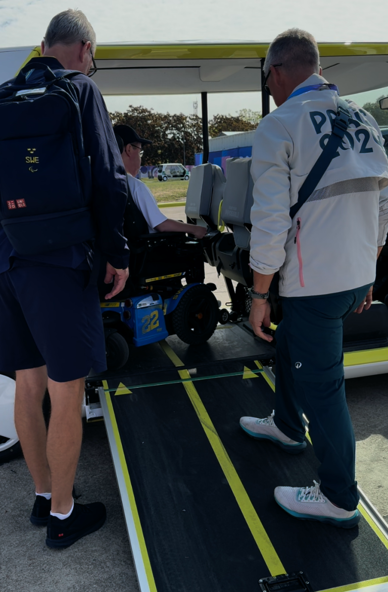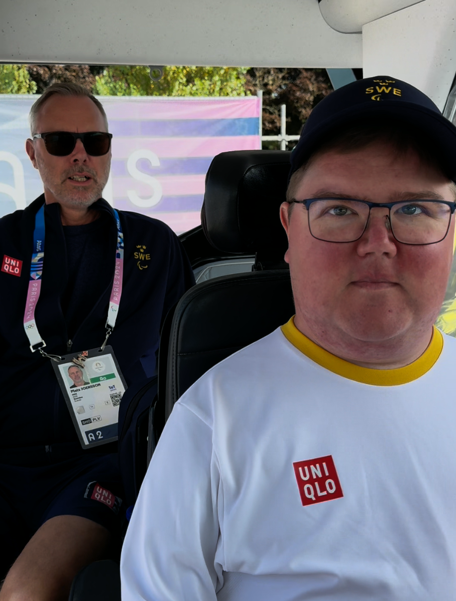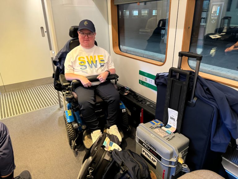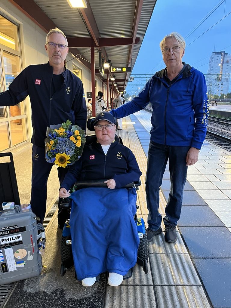 När vi hade fått allt vårt bagage, skulle vi bege oss till Clarion hotellet. Där blev vi mottagna med dryck och snittar. De som tog medalj blev intervjuade av media. Efter tillställningen gick vi mot Arlanda expressen och tog tåget. När vi gick av tåget satt vår älskade Saga där och väntade på oss. Efter en stunds mysande och pussande gick vi till tåget mot Skövde. När vi sedan gick av tåget i Skövde blev vi mottagna av Västra Götaland parasportförbund med en blombukett..
